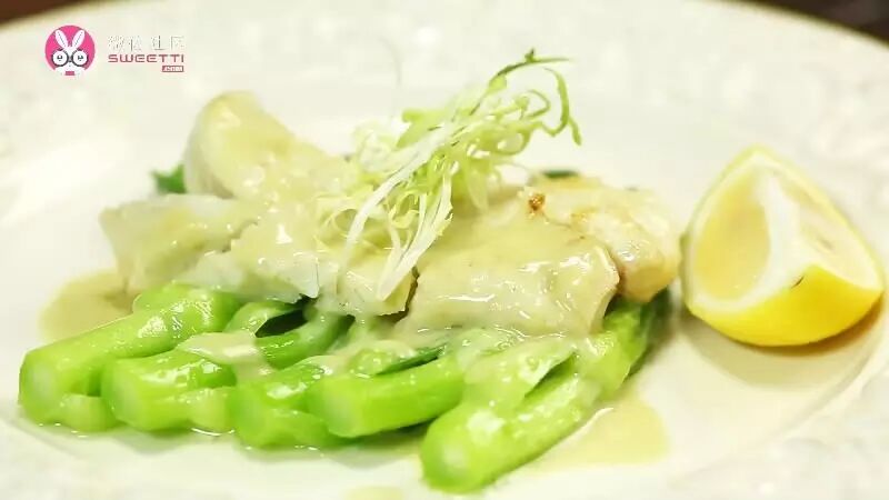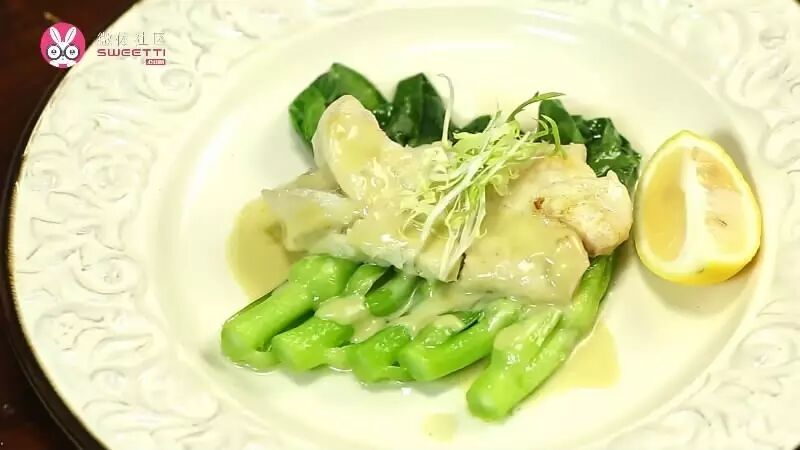 菜心铺底,放入煎好的鲈鱼,浇上奶油汁,最后放上少许苦菊点缀。