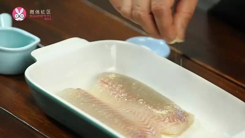 鱼肉用5g盐、5g白胡椒粉和少许白葡萄酒腌制10分钟。