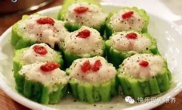 做法:苦瓜切寸段,掏空中间的芯和籽,肉馅的调法和之前那些肉馅菜的做法一样。调好的肉馅装进掏空的苦瓜圈圈里。上锅蒸,上汽后20分钟左右。