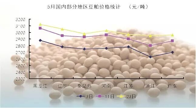 统计数据显示,5月全国主要地区豆粕价格环比继续上涨:1、黑龙江价格2880-3120元/吨,高于上月同期的2720-2880元/吨;2、秦皇岛价格2750-2980元/吨,高于上月同期的2450-2650 元/吨;3、江苏价格2780-2970元/吨,高于上月同期的2490-2680元/吨;4、广东价格2700-2960元/吨,高于上月同期的2300-2570元/吨。