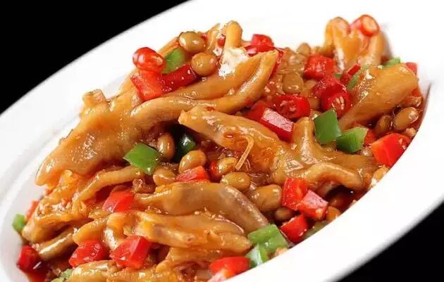 2.锅里放色拉油烧至四成热,下水豆豉先炒香,再放入卤好的去骨鸭掌、青红椒丁和小米椒圈翻炒,其间加美极鲜酱油、鸡精、味精、白糖和鲜露调好味,等淋入泡椒油和花椒油时,出锅装盘便好。