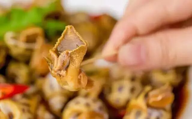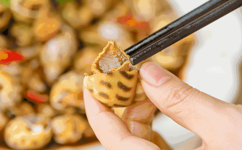 夹起一颗花螺,已能闻到一阵芥香,左手抓住花螺,用筷子顺着螺纹轻轻一挑,肉肉就被轻易扯出。(粗犷一点直接用牙,哈哈哈哈~)
