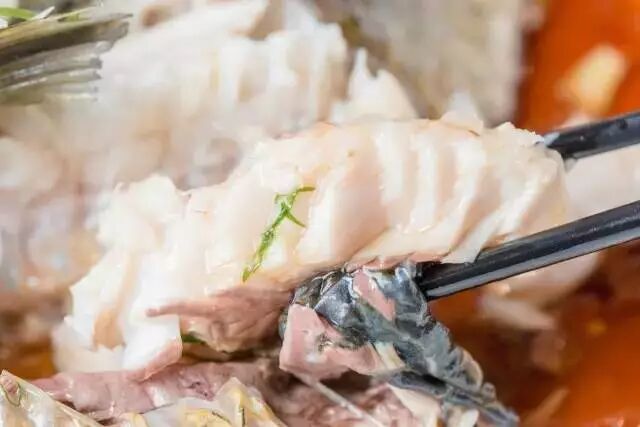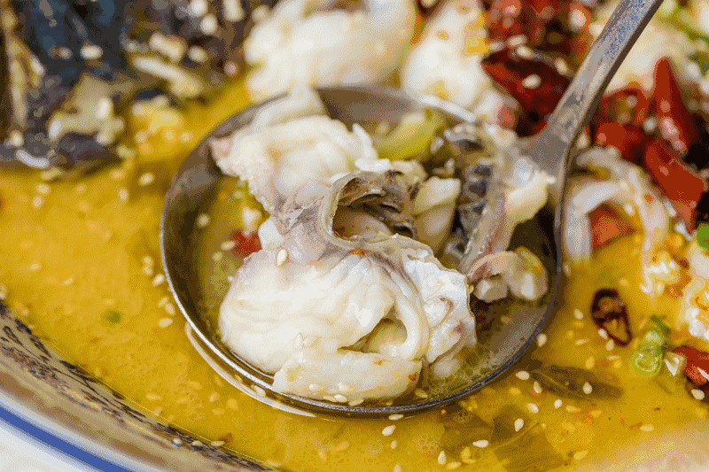 夹起一片鱼肉,口感紧致而不失嫩滑,味道鲜美有鱼味,酸菜鱼的烹调特色食利用酸菜让淡水鱼没有一点泥味和腥味,爽滑的口感几乎可以用肉眼感受。