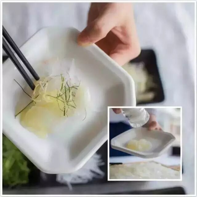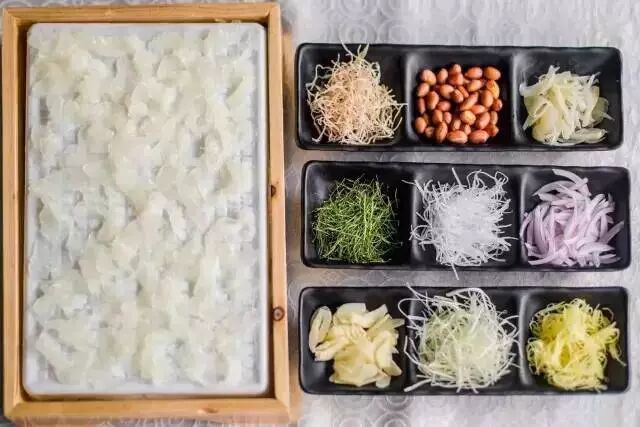 其二,就是厨师的刀工了,切生鱼片时候,不能太厚也不能太薄,太厚的话咀嚼时候容易起胶,影响口感,太薄的话,则失去分量感!简单一刀切出来的一片,正是考验厨师刀工的时刻。鱼片清澈透亮带着盈彩,没有土腥味。