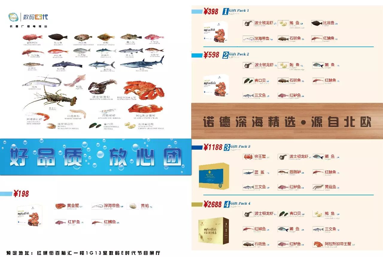 帝王蟹、波士顿龙虾、鲷鱼、蓝鲨、唇指鲈、红鮄鱼、三文鱼、红鲈鱼、黄菇鱼