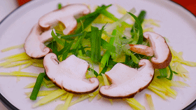 铺上香菇片、葱丝、生姜丝