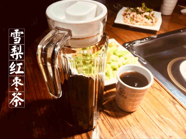 齐祺鱼锅特色饮品 :雪梨红枣茶,也是店里首推的特色饮品,采用雪梨、红枣为原料,煮好之后再过滤干净,喝起来那叫一个甘甜爽口,在吃鱼锅的时候喝一杯,生津止渴、美容养颜。