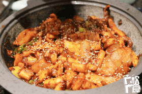 分量也是杠杠滴浓浓的韩国辣酱搭配墨鱼跟鲜炒的五花肉,再撒上白芝麻。唔~~好香哦