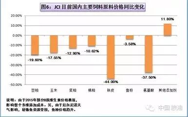 受厄尔尼诺现象影响,2014/15全球大豆、玉米总体丰产,但中国饲料产量下降和宏观消费疲软导致大豆价格同比降幅明显。同时,由于中国临储政策出现重大调整,玉米价格市场化逐步和国际市场并轨,因此今年来,主要饲料原料价格均出现了下行趋势。如图表6: