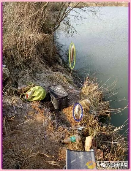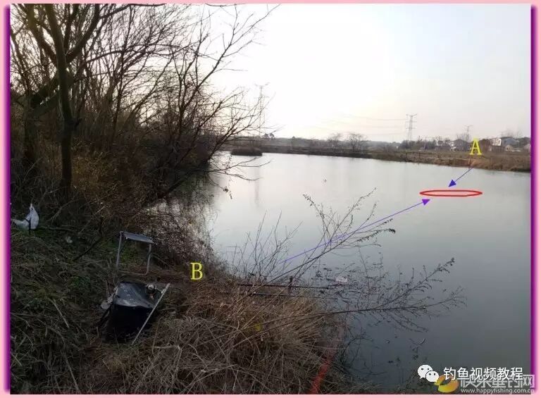 这个钓位我是第一次来,抛竿也是不太方便,岸边大、小树枝太多,就在A、B两个钓位之间的红圈处水下,有个几平米的障碍物,钩饵多次在这里被挂,今天还失去5枚钩子和一套串钩,还是尽量避免在这样的区域搜索哦!咱惹不起躲得起啊!哈哈哈!