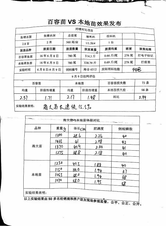 据了解,本次同塘对比在6月8-9日分别投放百容草鱼苗和本地草鱼苗各780尾,百容草鱼苗均重0.66斤/尾,本地草鱼苗均重0.69斤/尾,在相同条件下全程投喂海大豆粕型膨化草鱼料,至9月9日,百容草鱼均重2.37斤/尾,阶段性增重1.71斤/尾;本地苗均重2.17斤/尾,阶段性增重1.48斤/尾。