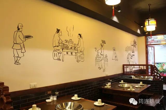 朝天娇火锅的包间的命名更是将地域文化发挥到了极致,不信我们来看一看,其包间共有六个厅,分别是筠连厅、巡司厅、沐爱厅、塘坝厅、双腾厅、民主厅,在每个厅的墙壁上绘有古代人不同的就餐素描,而且在每副画的旁边,有一句很有意思的对子。