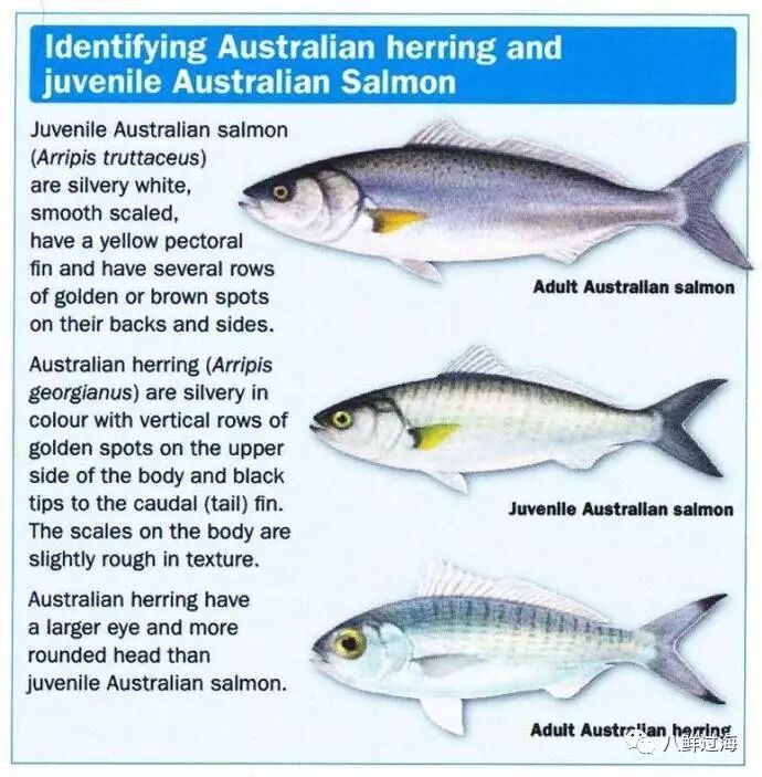 西澳大利亚三文鱼的幼鱼和澳大利亚鲱鱼的成鱼,很容易被搞混,一起对比可以看出差别,主要的后者的眼睛明显比较大。