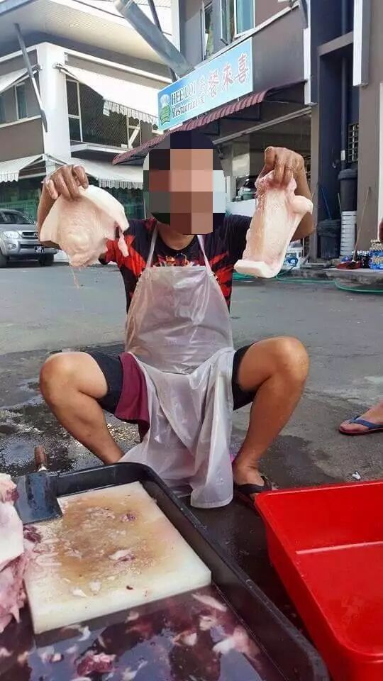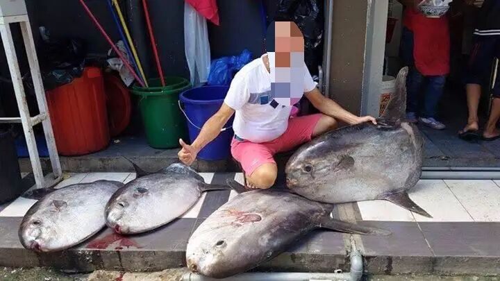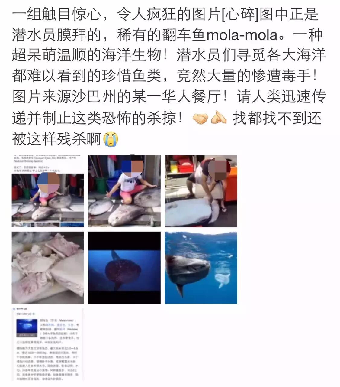 下午刷微博,看到一位认证的博友po出了如下图片,看起来是马来西亚沙巴州的一家华人餐厅,一个看似华人的食客,和三只餐厅门口的地上的小翻车鱼合影,另一张图片上有一位餐厅的服务人员,用刀子割下翻车鱼的尾鳍。画面触目惊人,让人看了心痛!