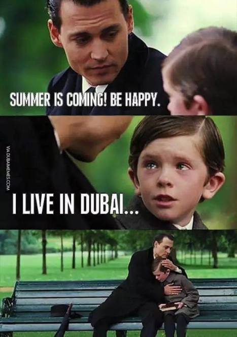 图配文:爸爸— 夏天要来了,开心点。儿子:可我在迪拜(哇的一声哭出来)