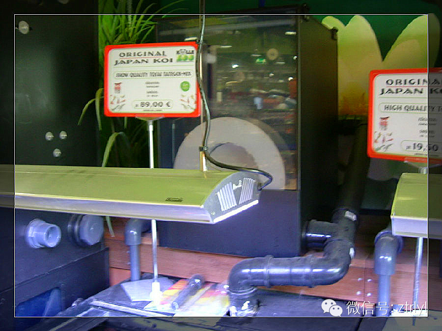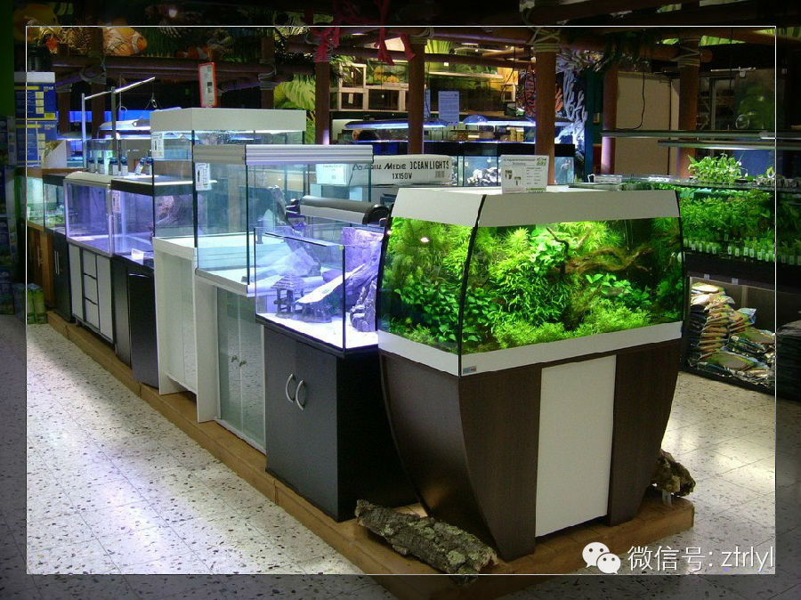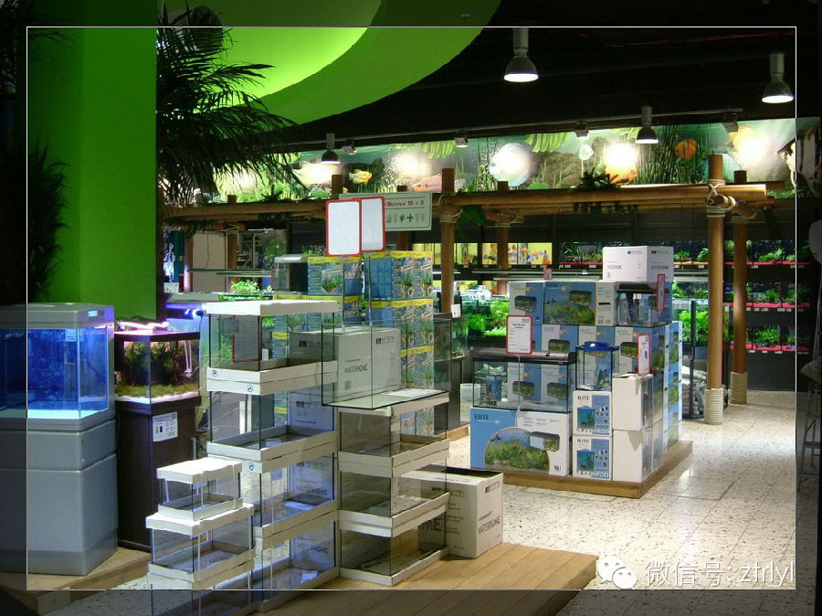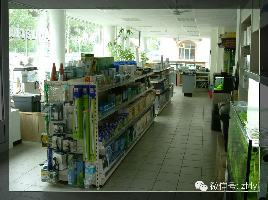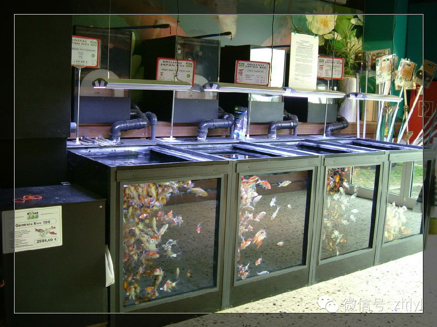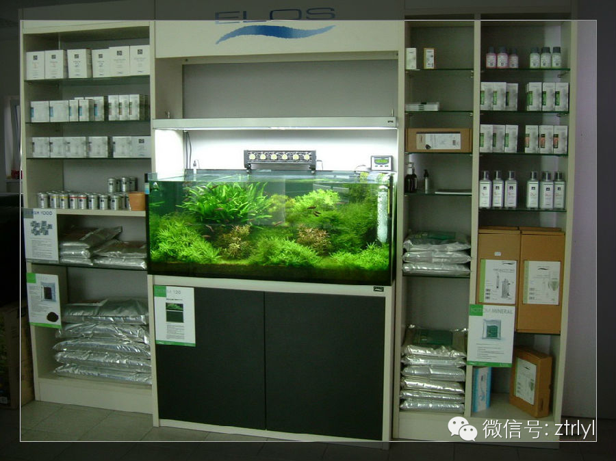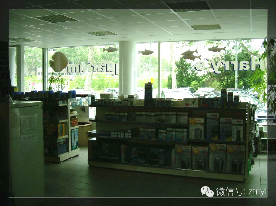 在居民区里,周围没有什么商场。这家鱼店里很干净,面积大约200多平米,鱼店主要经营淡水鱼、锦鲤、水草和相关水族产品。货物摆放整齐,鱼缸、排缸、水草缸,干净、明亮。估计是我们去早了,几个大的展缸进门时还没有开灯;看到有客户进门,有人过来把灯开开就忙自己的事了,也没有和我们打招呼。想必一看我们就是闲逛的 。在店里,还看到意大利顶级品牌ELOS的水草系列产品展示柜及展示缸,东西真不错。