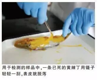 在实验室,谢主任发现这几条鱼身上都附着黄色粘液,用镊子轻轻一刮,黄色的粘液就全部脱落,鱼身变为了青黑色。