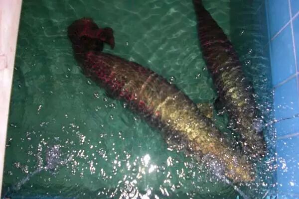 龙鱼中体型最大的,最重可达二百公斤。体长呈梭形。头部极长,头长超过体长一半。一对吻须,短小位于腹面。