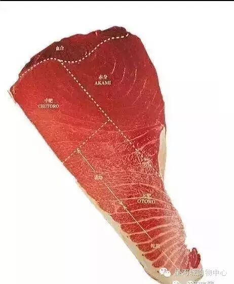 赤身( Akami)取自鱼体背部,金枪鱼的赤身量很多,脂肪含量最少。因为脂肪含量少,肉质坚实具嚼感。赤身中富含的清爽香味与酸味,具有其他部位鱼肉无法匹敌的魅力。恬美安详的细腻感,同时赤身与酱油也十分匹配,经常用来制作渍赤身寿司。口水要粗来啦!