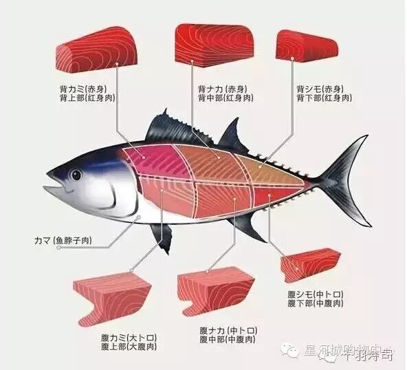 不同部位的肉质有着不同口感,根据金枪鱼的身体部位含脂量不同,细分为赤身Akami,中脂Chutoro,大脂Otoro,大脂又分为霜降和蛇腹。
