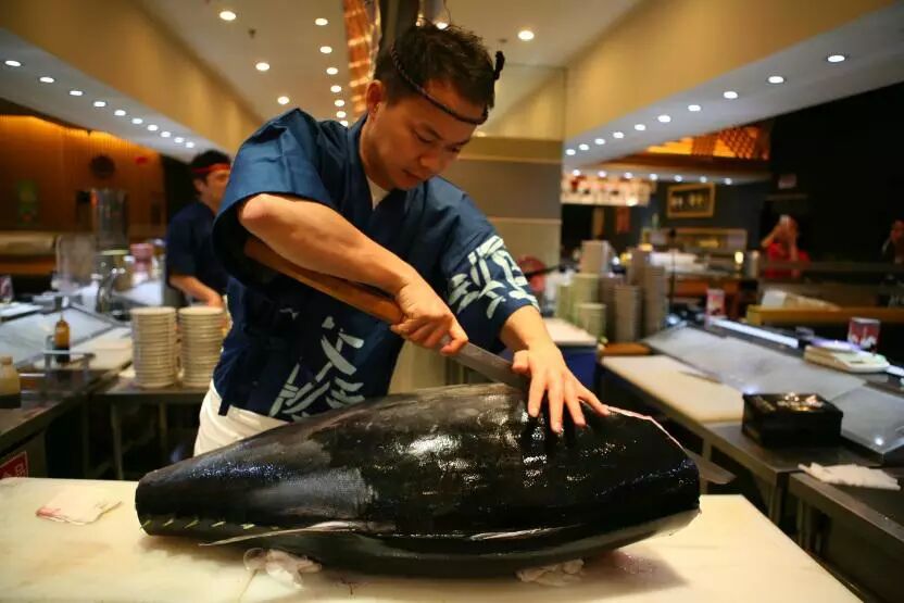 由日本专业厨师解体从日本空运过来的黑金枪鱼(45KG)