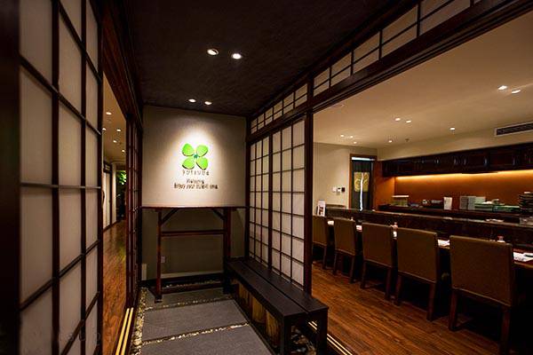 这是三环与蓝港之间的一条小路,也是意外的安静,沿河边徒步走到富驿酒店就能看到四颗绿叶的招牌,四叶寿司就坐落在这美景之间。标志上的四片叶子,分别代表股东、员工、顾客和供应商。与供应商有良好关系也是四叶保证提供最新鲜优质的食材给顾客的秘诀之一。日本拥有全球最大的鱼市场,是全球高级餐厅采购高端海鲜的主要集散地,每一家四叶使用的主要原材料,如:金枪鱼、牡丹虾、海胆、海苔、大米及多数原辅料均从日本直接进口。来这里能享受到与全球高级餐厅同步的新鲜食材。不仅只有这些,店内装潢还是由全球著名设计师事务所日本设计师事务所的原田裕之设计师亲临现场量身设计。所以来到四叶,拥有身移日本的体验。