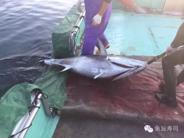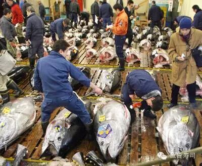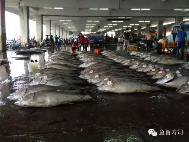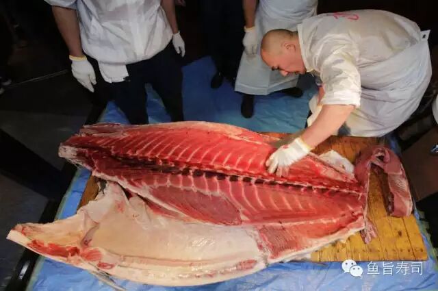 通常在这个步骤,金枪鱼将在经纪人的铺子里分割,以保鲜的包装分块空运到门店。不过这次,鱼旨君给大家带来的是原条整只的金枪鱼,如此壮观的景象可是独此一家哦。