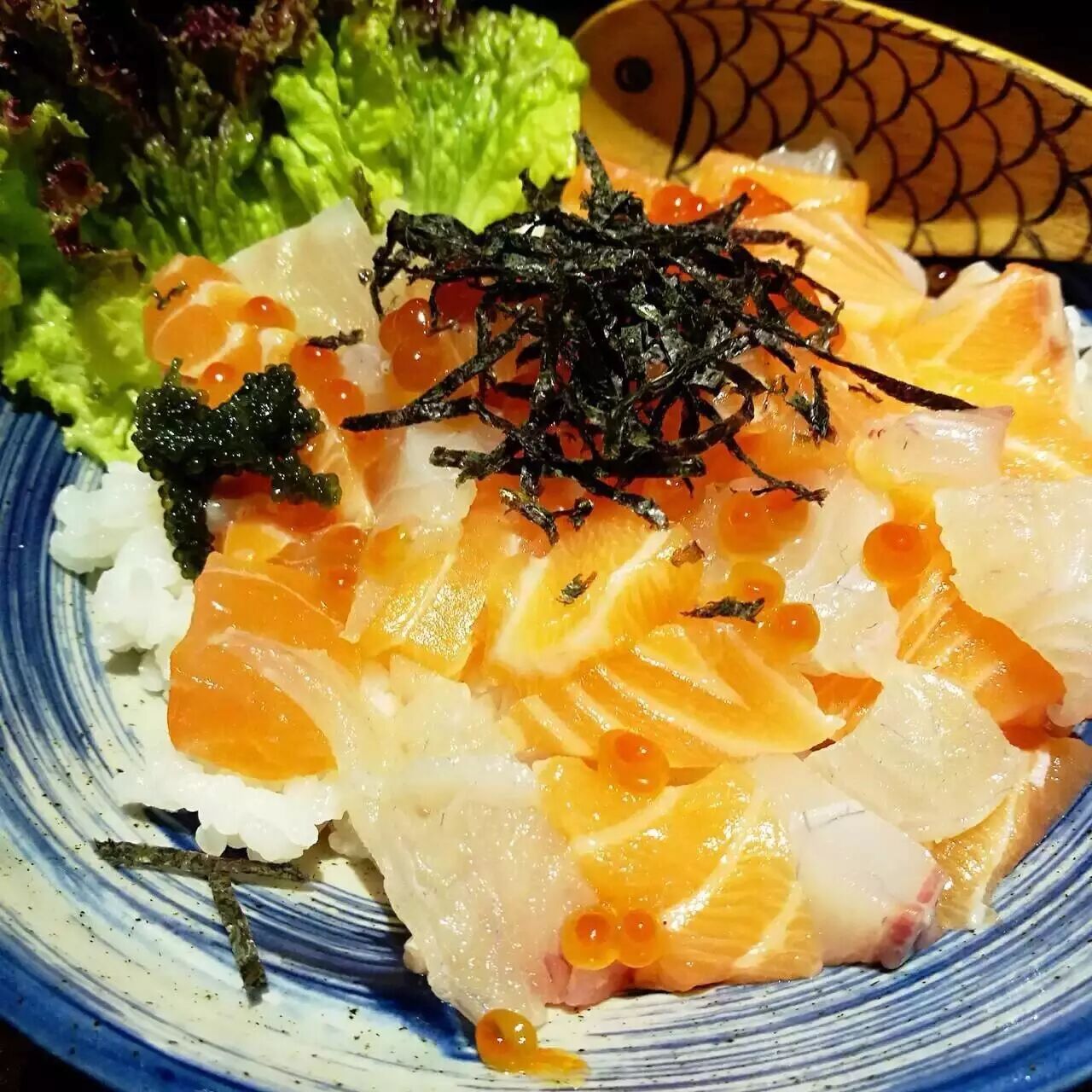 然后是这里的主食。嗷~也是加分的。切角鱼生饭,鱼生很多。