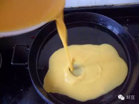 铁板放火上烧热后刷一层油,打好蛋液 ↓