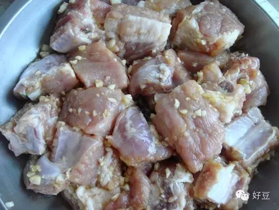 浸泡好的排骨控干水加蒜末,胡椒粉,料酒,盐