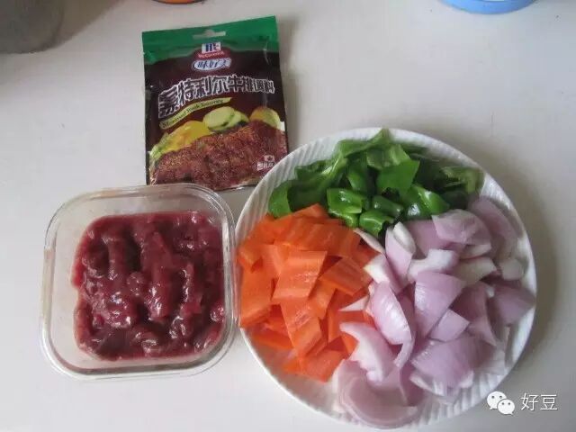 原料:牛肉、洋葱、青椒和胡萝卜切成片,