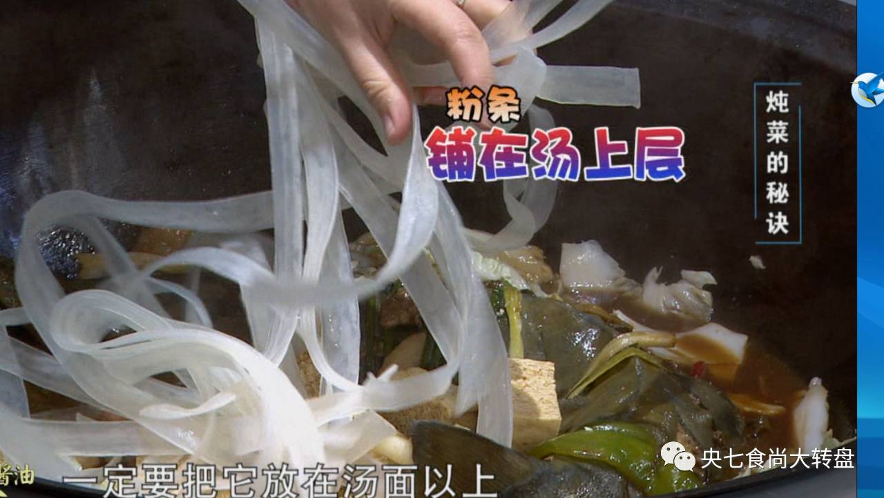 10、干粉条下锅,铺在所有食材上面(半蒸半焖,不易糊锅)接着小火炖煮至其他食材吸收汤汁、断生入味即可