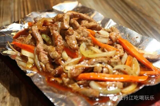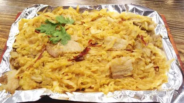 用铁盘锡纸装着,大酸菜、肥瘦相间的五花肉,香而不腻,地道东北菜就是这么诞生的,就是一个字,可劲造!