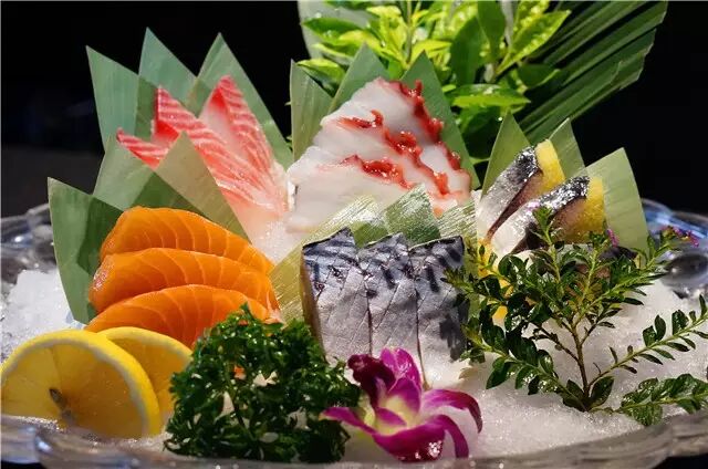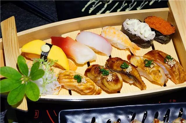 芒果三文鱼、北极贝寿司、飞鱼子寿司、汁烧帆立贝、鳗鱼等等。