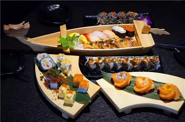 一大波寿司船舰队方阵正在靠近(船不在于大,贵在列队出击,听我的,保你不吃亏!),盛载着N多件寿司,款式多到你怀疑人生,让人眼花缭乱!