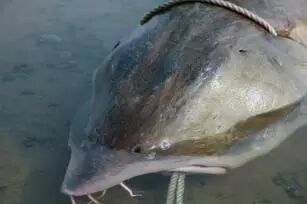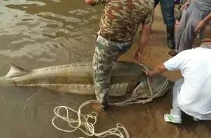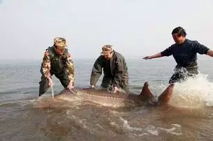 据介绍,21日中午同江市渔民李某、张某在街津口下滩滩地捕鱼作业时意外捕获一条长达220厘米,重达400斤的雄性鲟鳇鱼。由于鲟鳇鱼是濒危物种,所以捕捞后李某立即拨打了报警电话,街津口边防派出所官兵们赶到现场后,帮助渔民把这条鲟鳇鱼妥善安置在了岸边的深水区。