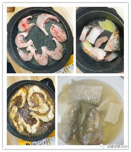 鱼头鱼尾下油锅多煎一会儿放入姜片,加开水,料酒,盐,小火炖十分钟后加入冻豆腐,继续炖半个小时,调味,出锅。