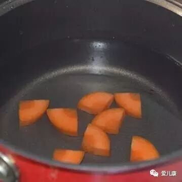 胡萝卜切薄片放入锅里煮,煮软后取出压碎,煮胡萝卜的原汤保留;