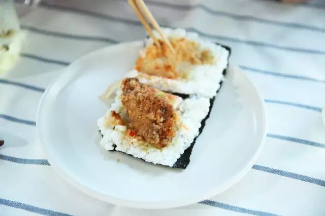 蛋皮,烤到焦黄的鸡排与饭团无缝对接,超乎性价比的大块鸡排让你每次咬下都能一口米饭一口肉,不怕一两下间就只剩下米饭的尴尬。
