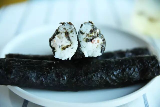 简单的包装,内里的实物也不耍花俏。是照旧的紫菜包饭,大粒软糯的米饭拌上了醋,被紫菜老实巴交地紧紧裹住。