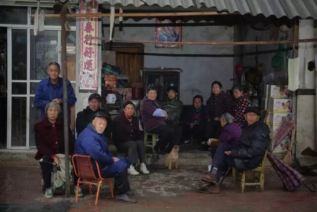 老人和狗排排坐在空旷的宅院前晒太阳。![]()