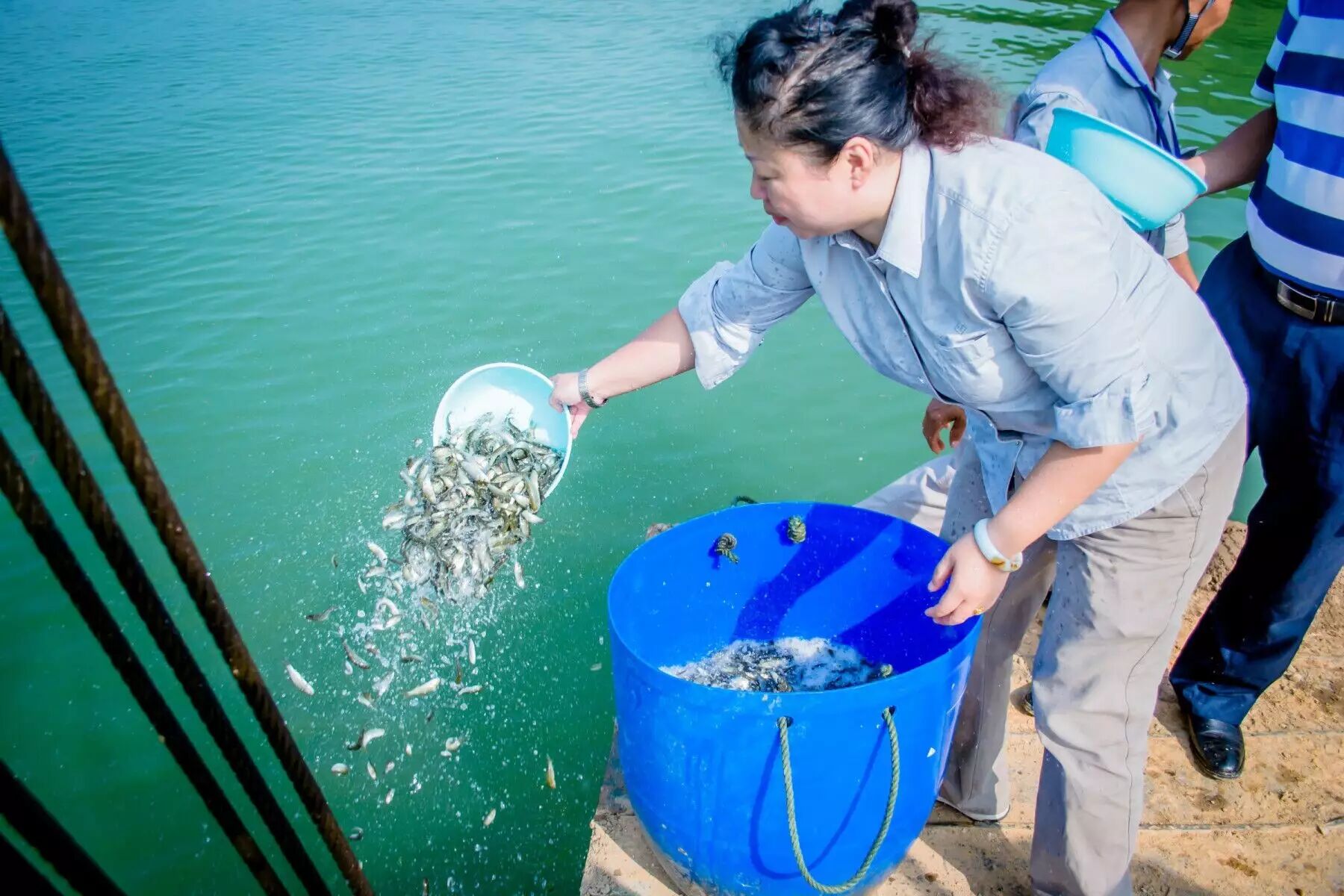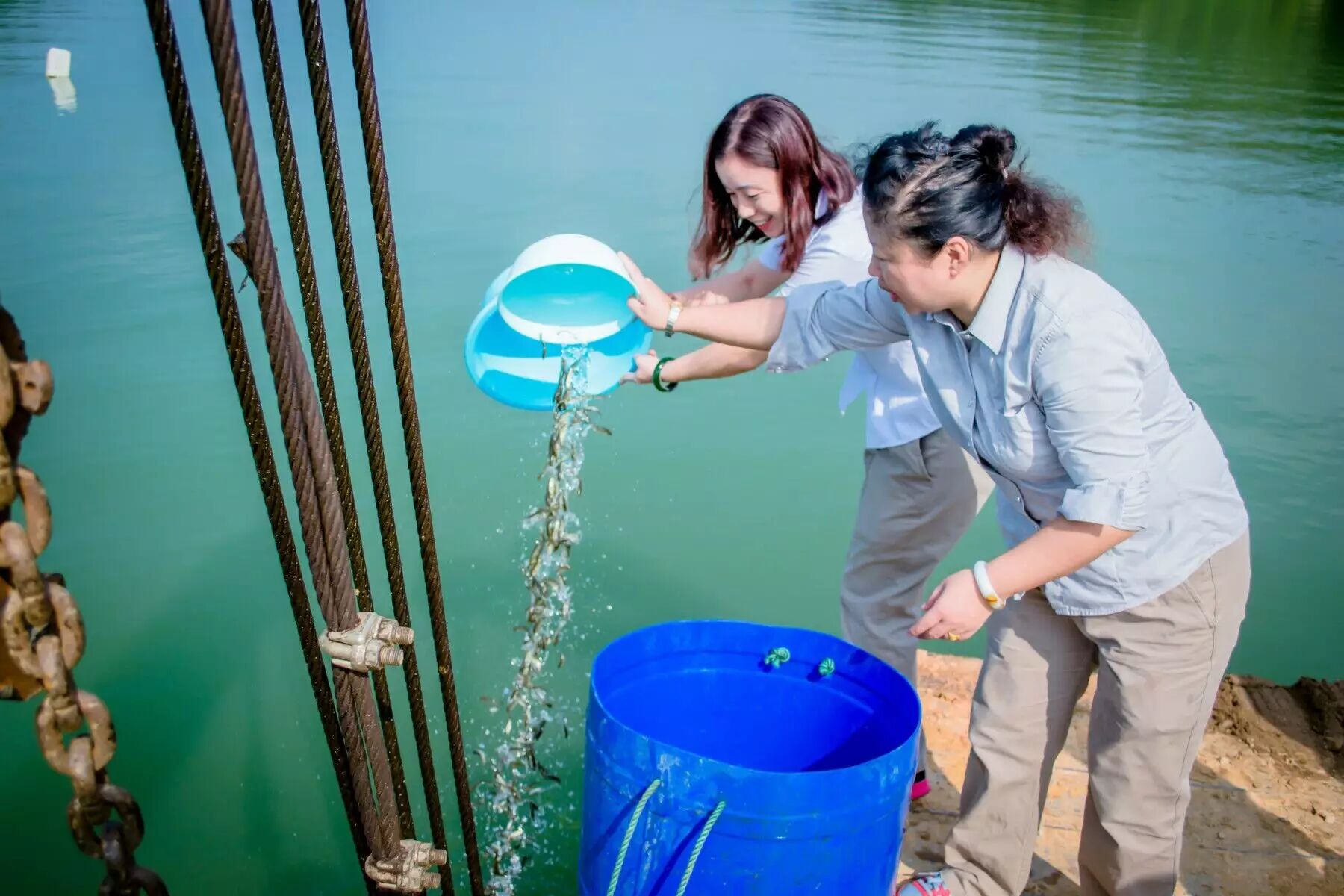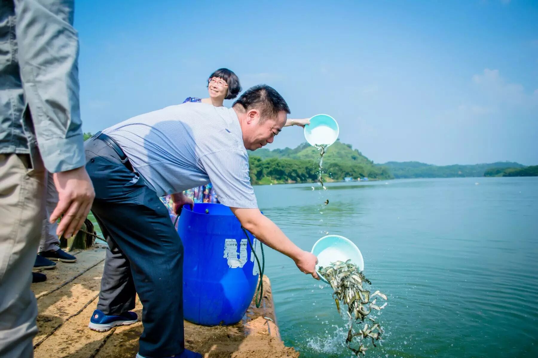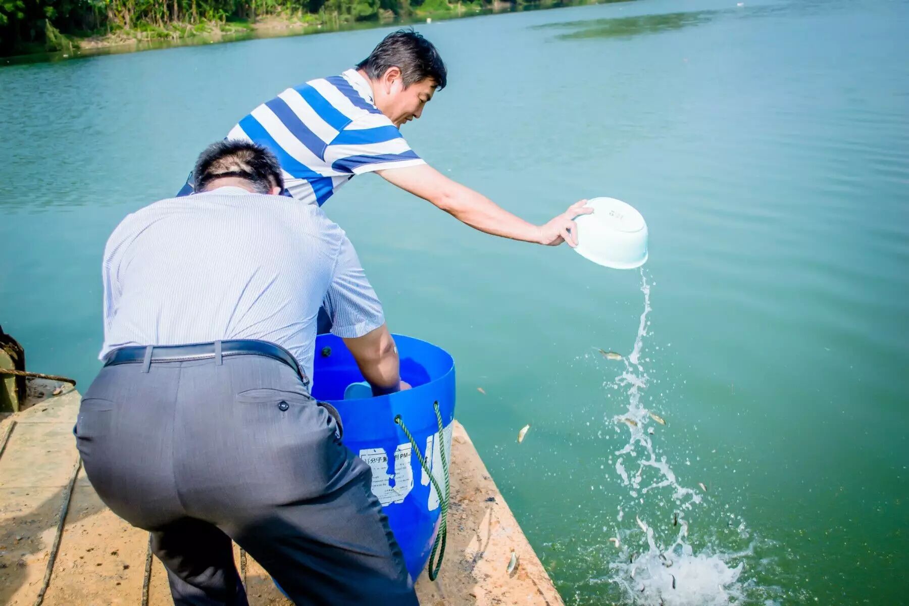 各单位代表亲手将草鱼、青鱼、倒刺鲃、光倒刺鲃等四种鱼苗放流于桂江之中。