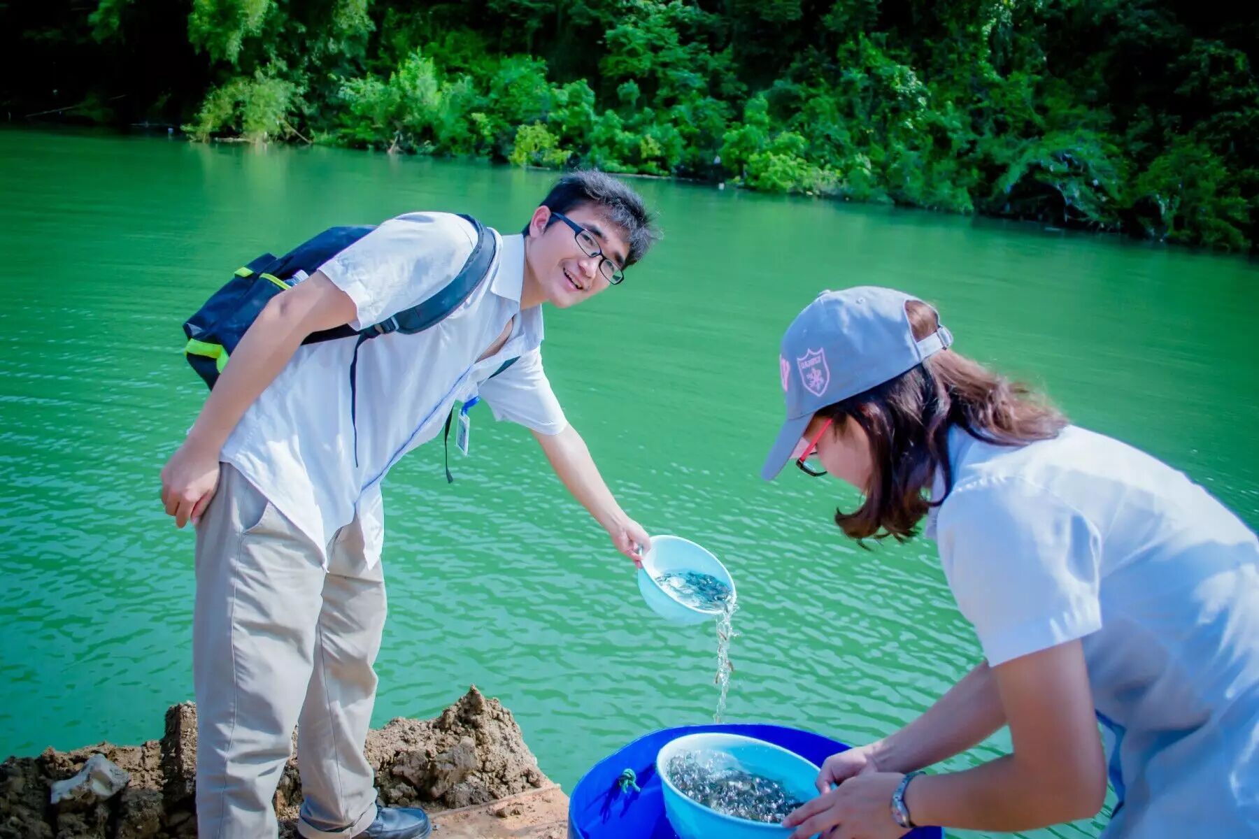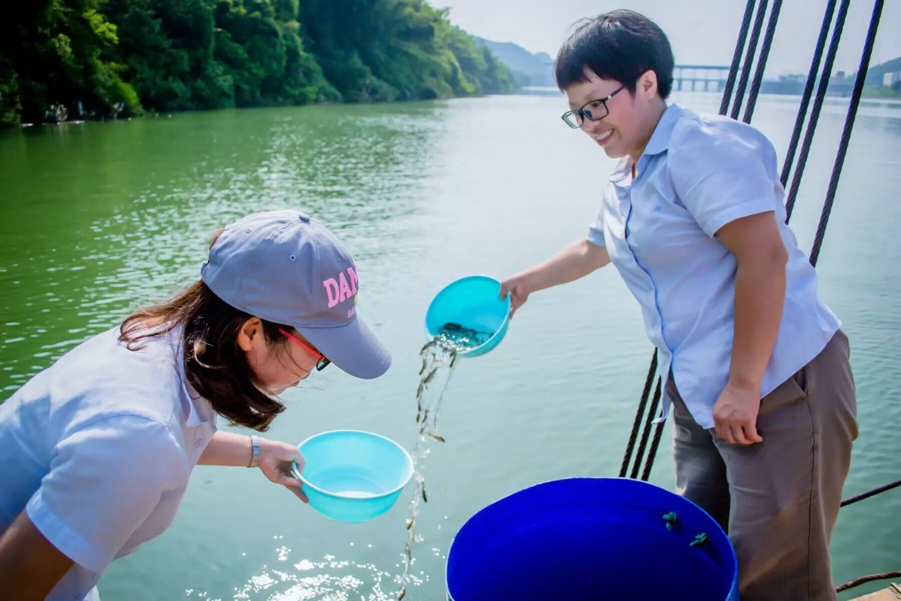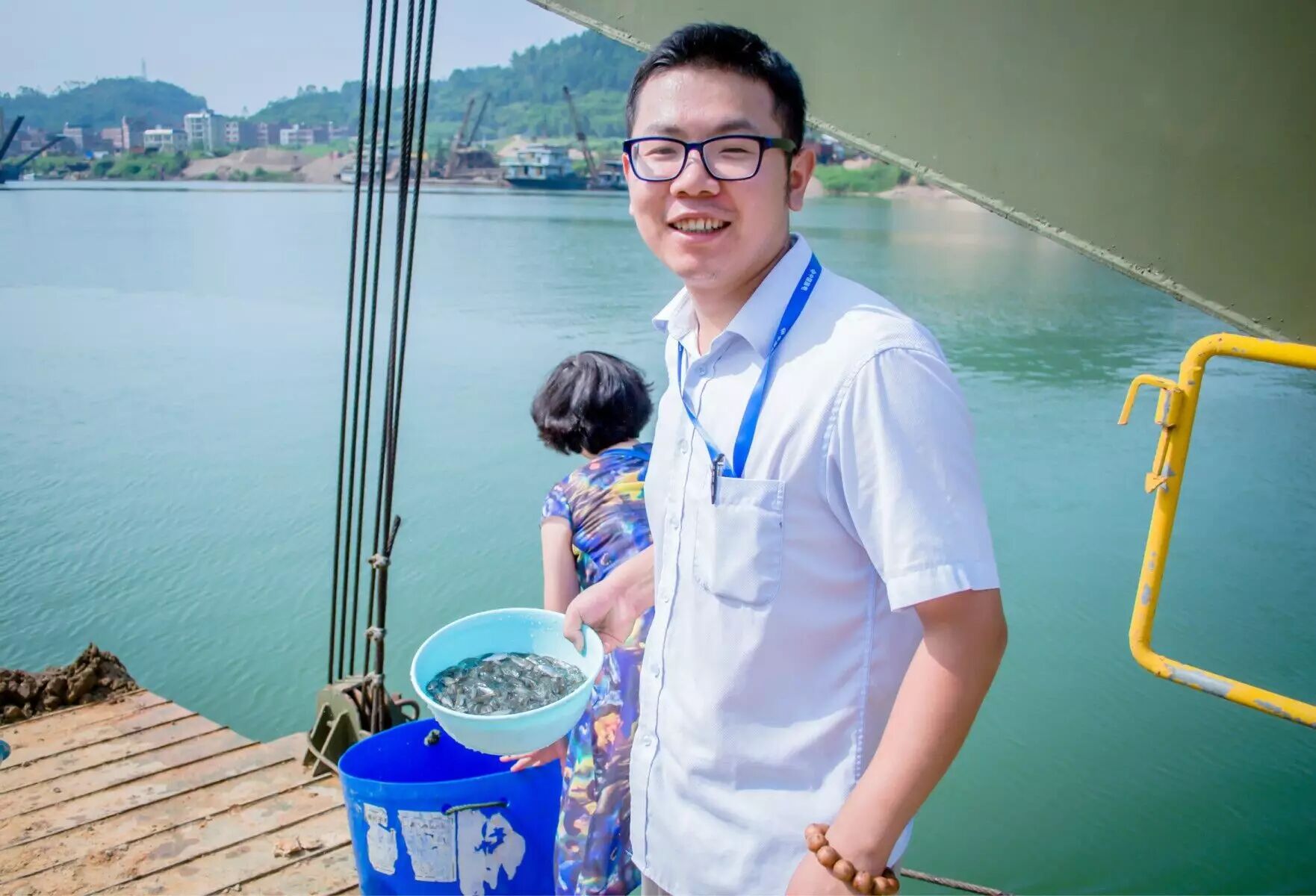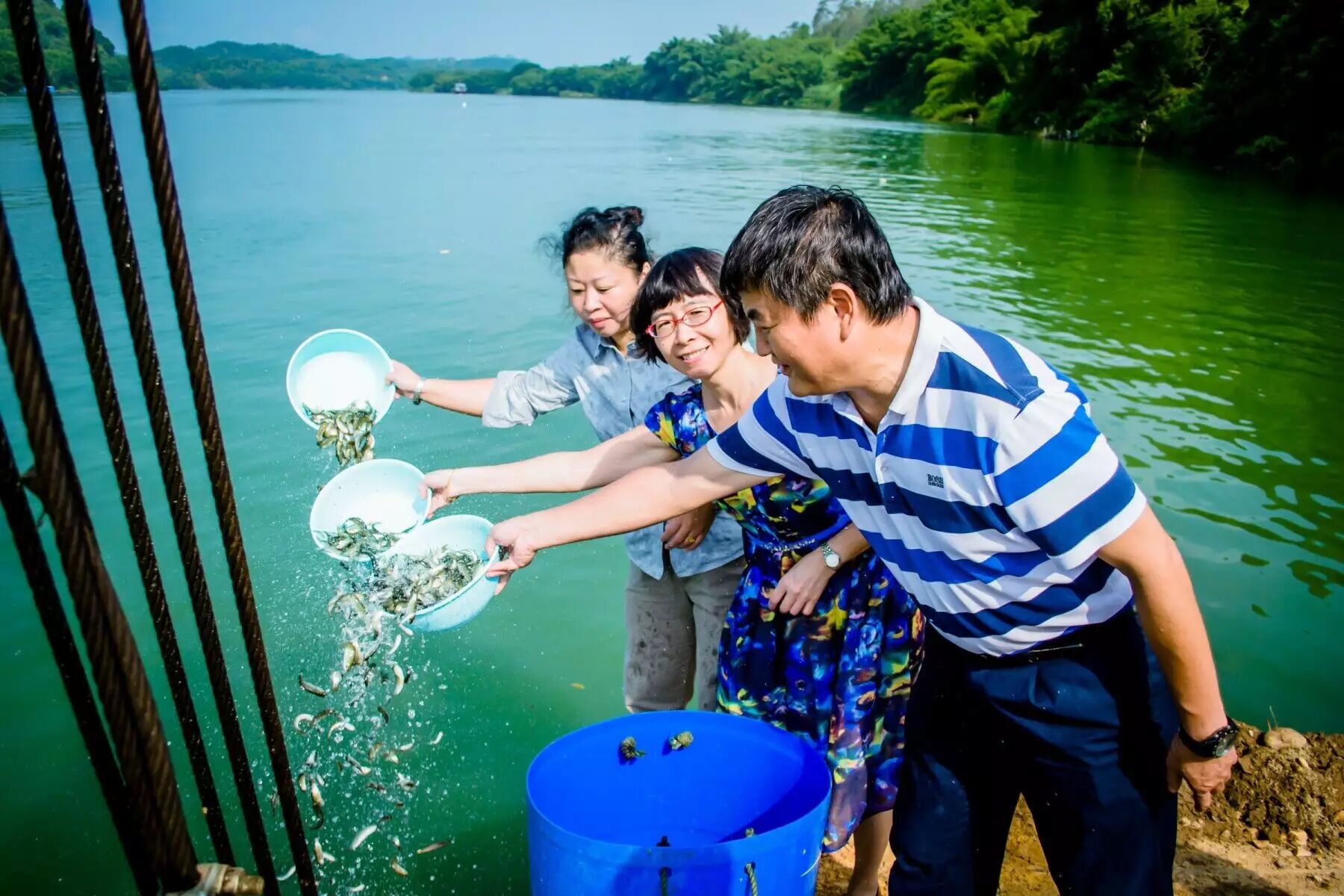 各单位代表亲手将草鱼、青鱼、倒刺鲃、光倒刺鲃等四种鱼苗放流于桂江之中。
