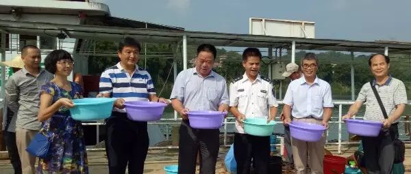 各单位领导已做好姿势,准备往清澈的桂江投放鱼苗。