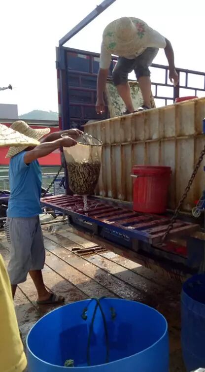 从运载车上卸下即将投放桂江的数万尾鱼苗。