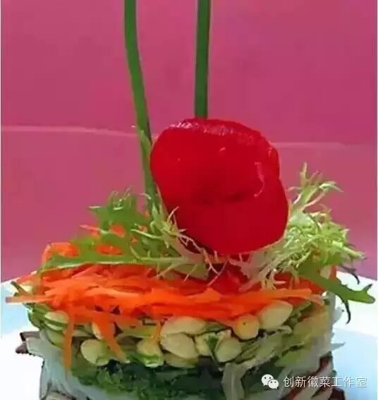 6、将红彩椒片成三片,加入少许盐腌一下,然后卷成三层玫瑰花,放在做好的蔬菜塔上,后面插上两根香葱,搭配少许生菜,即可上桌。