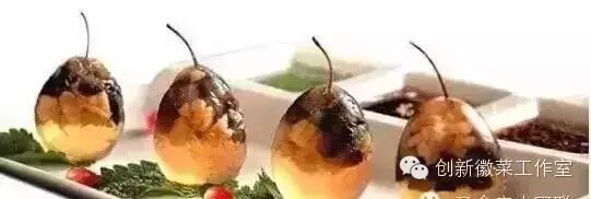 3、走菜时取出,剥去蛋壳,摆在盘中,大头朝下,小头朝上,分别插入梨子把儿。