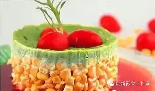 3、红蕃茄1个烫去皮,将蕃茄肉打成汁,调入罐装玉米的原汁和3克蜂蜜搅匀,浇入盘中即可。