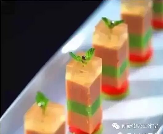 4、调好的凝胶汁凉至常温后,浇在盘中鹅肝泥上,继续冷藏15分钟。走菜时,取出做好的鹅肝冻改刀,放在盘中水果片上,点缀即可。