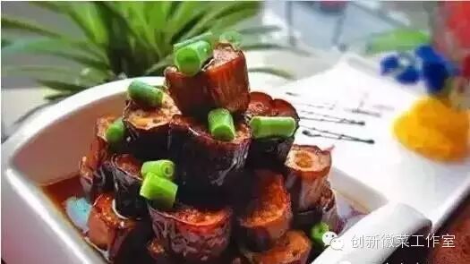 2、入冷的自制卤水中浸泡2--3小时至入味(也可用热卤水浸泡1小时入味),走菜时取出茄子墩摆好,浇上少许自制卤水(为了提亮),撒上鲜豇豆丁即可。